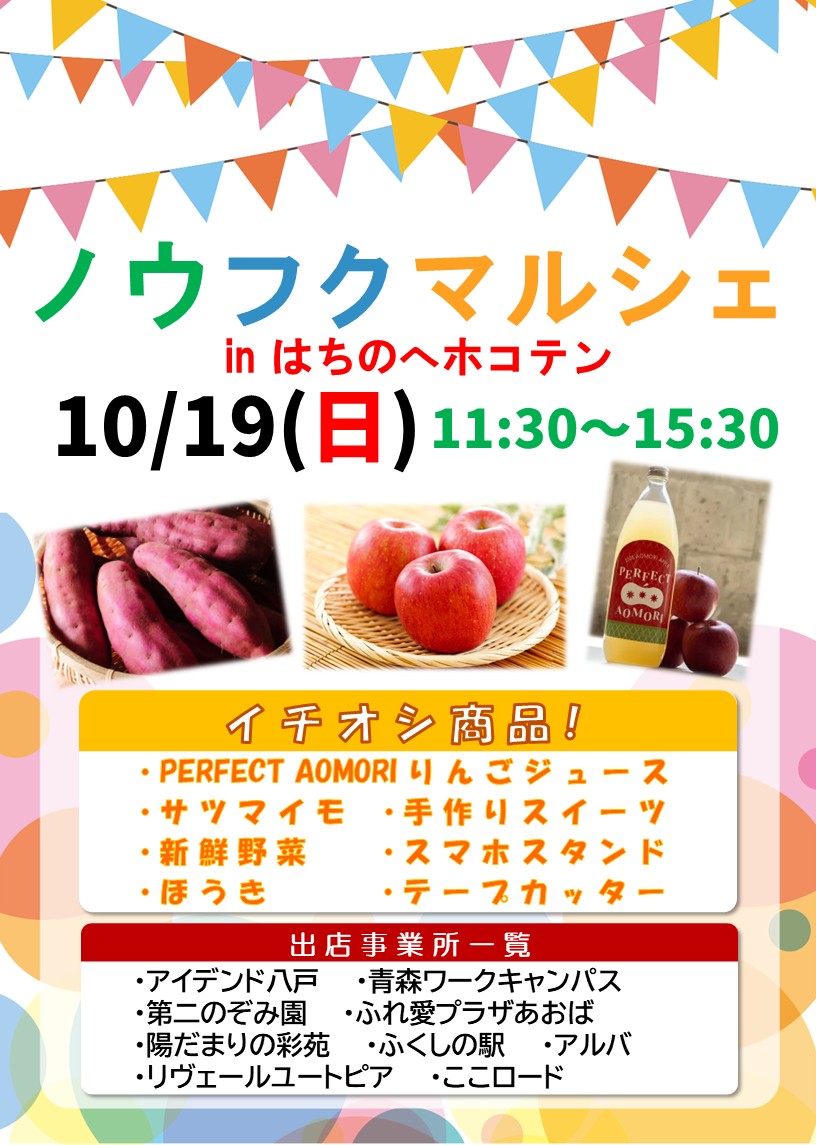 本日、ノウフクマルシェが八戸市中心街十三日町前の「はちのへホコテン」にて開催されます!ノウフクマル